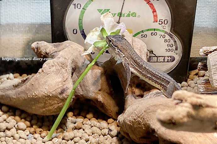 昼行性のカナヘビは夜はぐっすりなので、同居しているとはいえ、もしかしたら夜行性のヤモリの存在に気がついていないかもしれません。