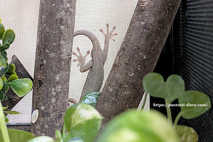 こちらのヤモリはもう1匹のヤモリに比べて警戒心が強く、日中はほぼ隠れている(えさやりの時だけひょこっと顔を出します)のもあって、無事に同居できています、良かった!!