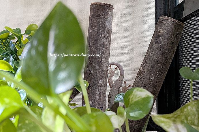 元々ヤモリケージで使用していた昆虫用止まり木✕2を入れて、隠れ家を多くしました。