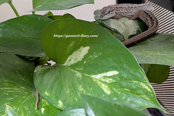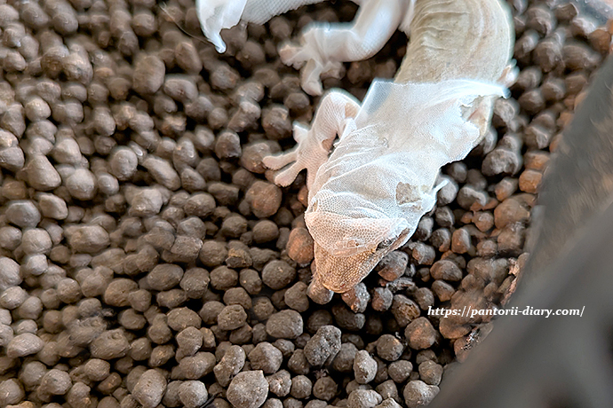 こちらは3歳半になるヤモリ。珍しく脱皮途中の姿を見ることができました!