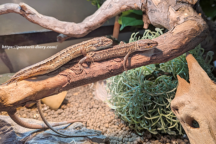 電球交換後、早速日光浴にきたカナヘビたち。温かそうです。